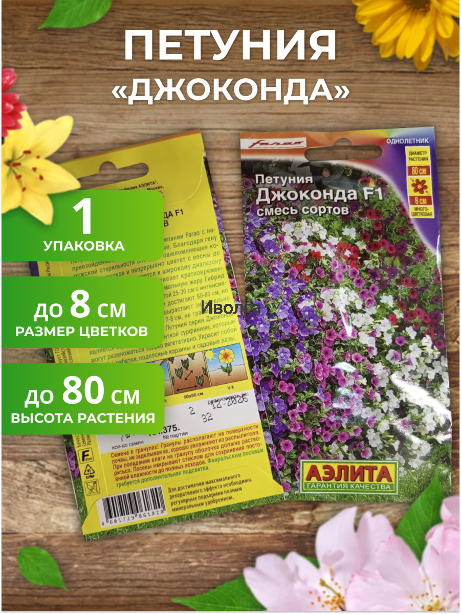 Петуния "Джоконда F1" смесь сортов - петуния итальянской селекции компании Farao с непревзойденными характеристиками. Благодаря гену мужской стерильности она дает ошеломляющее количество цветков и непрерывно цветет с весны до поздней осени. Адаптируется к широкому диапазону температур – успешно выдерживает кратковременные заморозки до -5 °С и экстремальную жару. Гибрид формирует мощные кусты высотой 25-30 см с интенсивным ветвлением. В ширину они достигают 60-80 см, но при регулярных подкормках вырастают значительно большего размера. Цветки ? 7-8 см, не травмируются дождями и сильным ветром. Петуния серии Джоконда является серьезной конкуренткой сурфиниям, которые могут размножаться только вегетативно. Украсит собой клумбы, рабатки, подвесные корзины и садовые вазы.